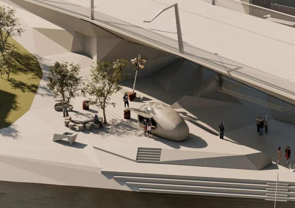 The installation will extend to the Podolí bank, where the 42-by-80-meter area beneath the bridge has been reimagined to include a skate park, an outdoor theater arena and a neo-cubist statue titled Heavy Head Boy.
